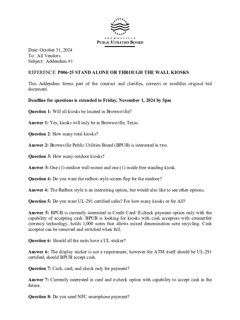 This document is an addendum to the original bid for stand alone or through the wall kiosks, providing clarifications and modifications regarding the specifications and requirements. It includes details