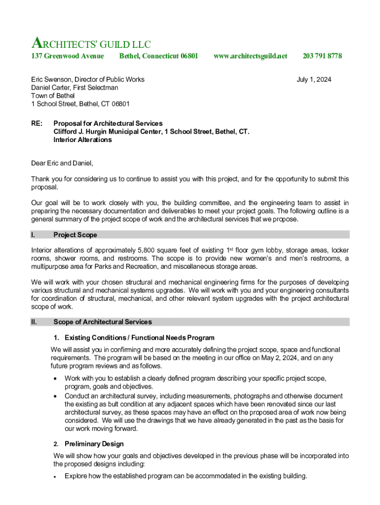 This document outlines the proposal for architectural services related to the interior alterations of the Clifford J. Hurgin Municipal Center, including scope of work, architectural services offered,