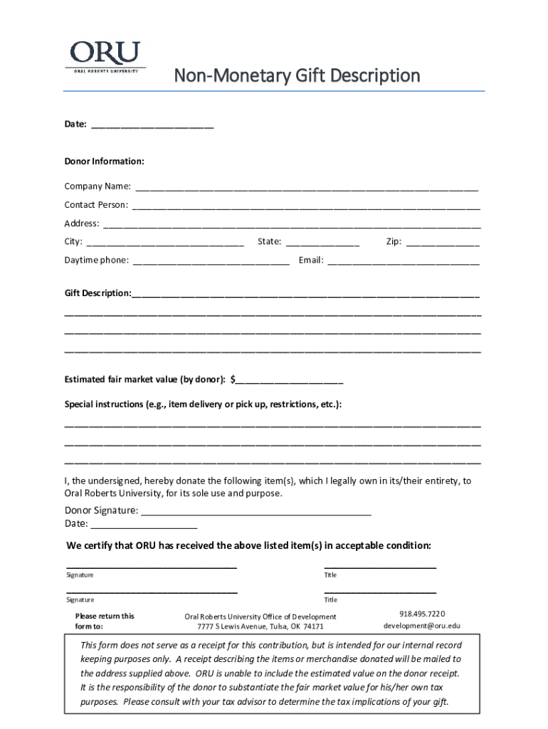 A non-monetary gift description refers to the detailed account of gifts that are given without any cash value. These gifts can include items such as real estate, artwork, or services that do not directly involve money.
