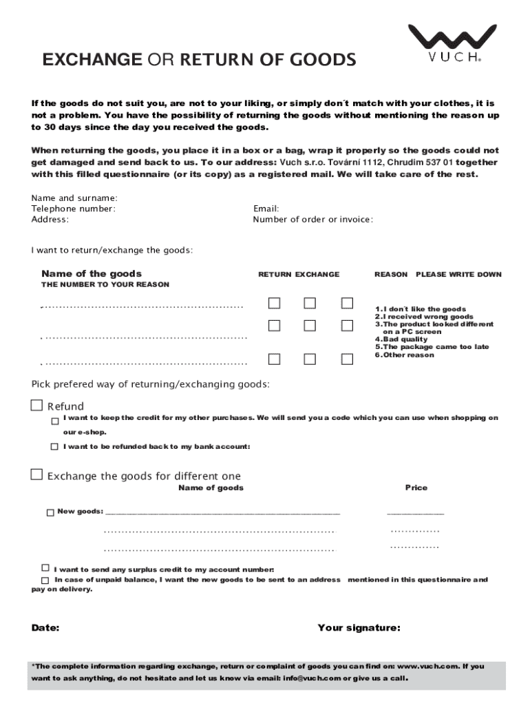EXCHANGE OR RETURN OF GOODS If the goods do not suit you, are not to your liking, or simply dont match with your clothes, it is not a problem. You have the possibility of returning the goods without