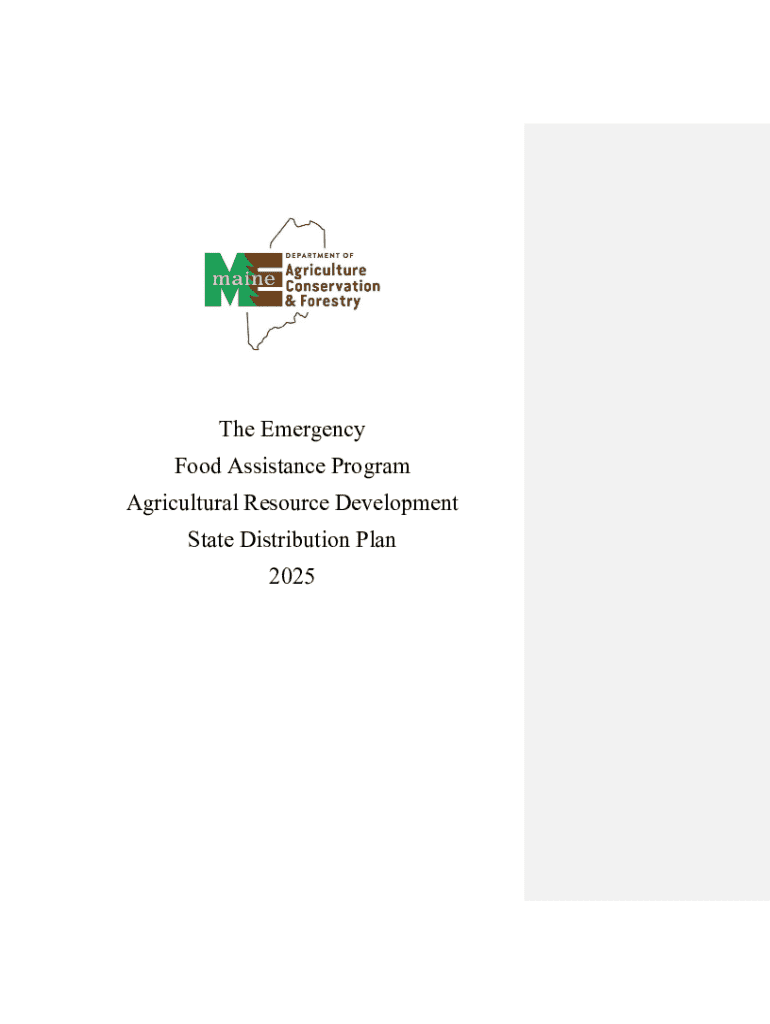 Este documento describe el Plan de Distribución del Programa de Asistencia Alimentaria de Emergencia del Departamento de Agricultura, Conservación y Silvicultura de Maine, que se encarga de distribuir
