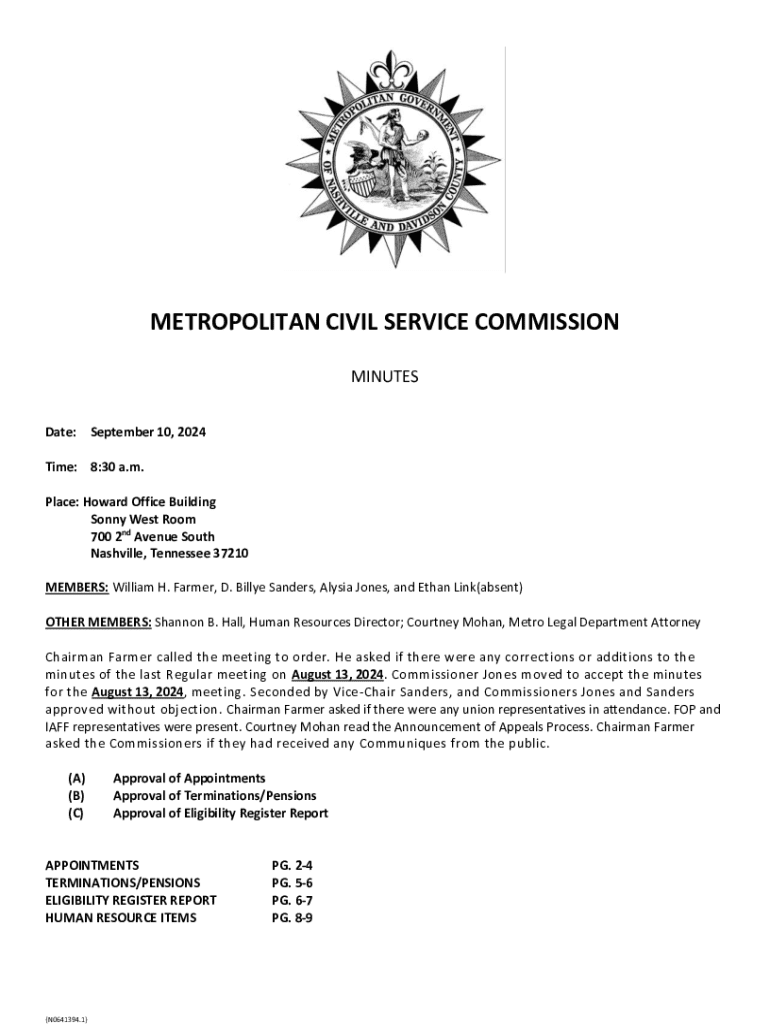 METROPOLITAN CIVIL SERVICE COMMISSION MINUTES Date:September 10, 2024Time: 8:30 a.m. Place: Howard Office Building Sonny West Room 700 2nd Avenue South Nashville, Tennessee 37210 MEMBERS: William