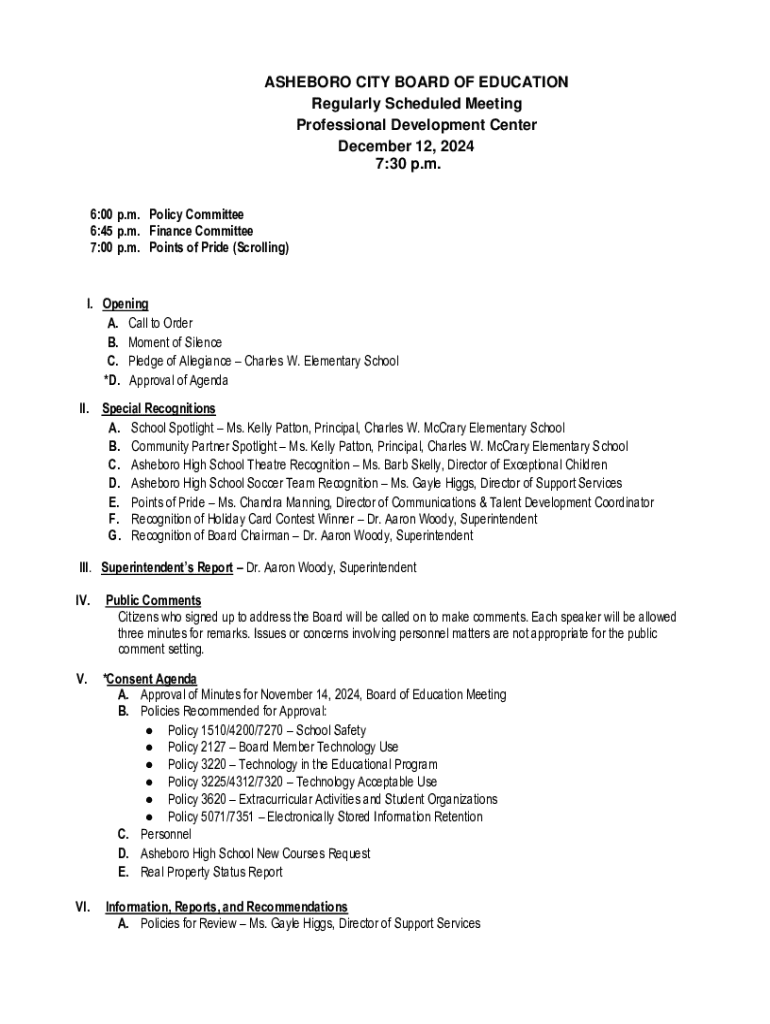 ASHEBORO CITY BOARD OF EDUCATION Regularly Scheduled Meeting Professional Development Center December 12, 2024 7:30 p.m. 6:00 p.m. Policy Committee 6:45 p.m. Finance Committee 7:00 p.m. Points of