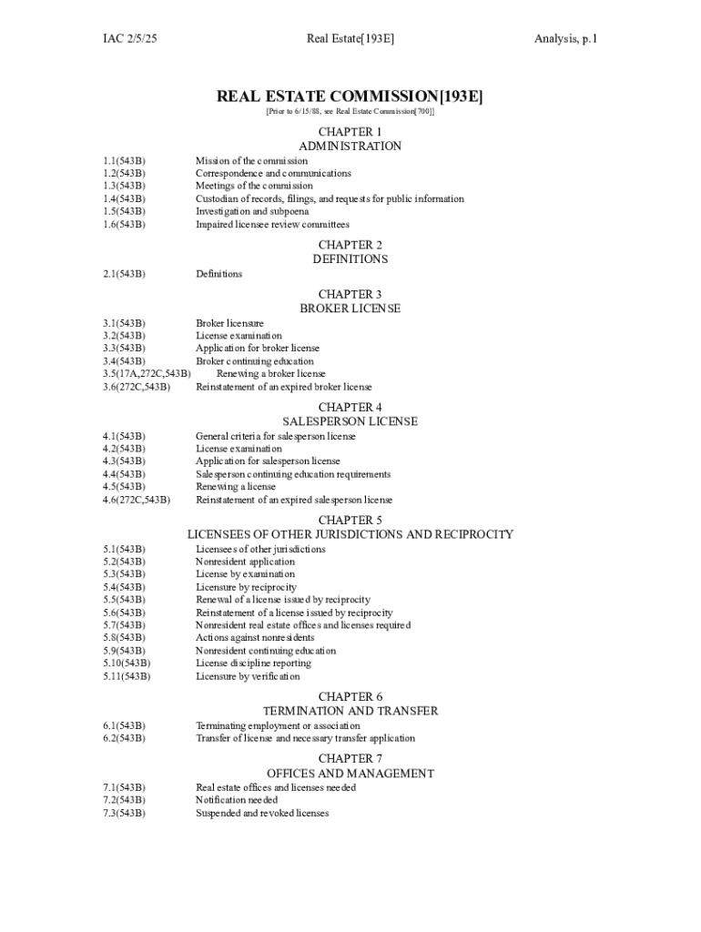 IAC 2/5/25Real Estate[193E]REAL ESTATE COMMISSION[193E] [Prior to 6/15/88, see Real Estate Commission[700]]CHAPTER 1 ADMINISTRATION 1.1(543B) 1.2(543B) 1.3(543B) 1.4(543B) 1.5(543B) 1.6(543B)Mission