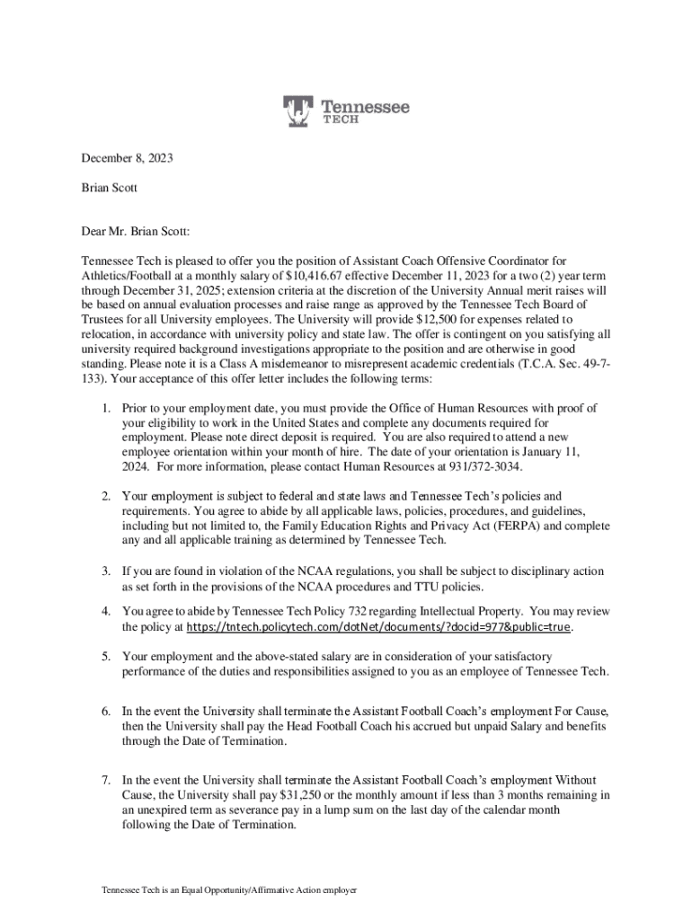 December 8, 2023 Brian ScottDear Mr. Brian Scott: Tennessee Tech is pleased to offer you the position of Assistant Coach Offensive Coordinator for Athletics/Football at a monthly salary of $10,416.67