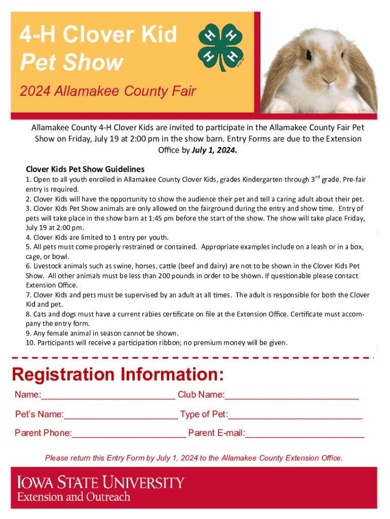 This document outlines the guidelines and registration details for the Allamakee County 4-H Clover Kids Pet Show taking place on July 19, 2024. It provides information on eligibility, entry requirements,