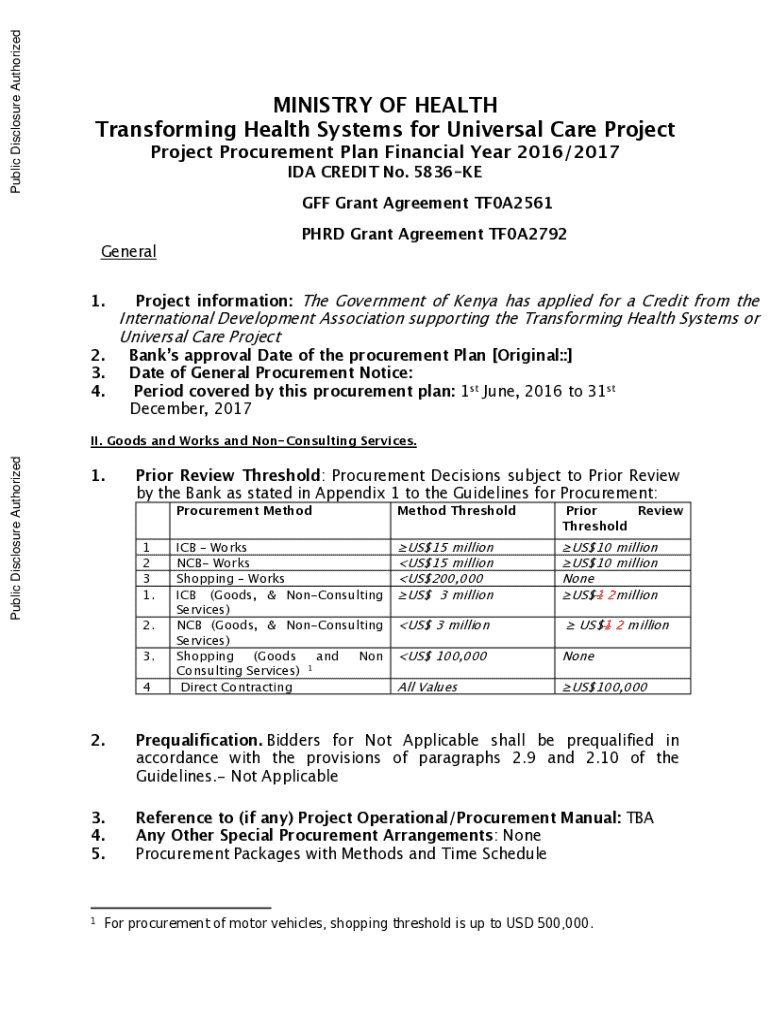 Public Disclosure AuthorizedMINISTRY OF HEALTH Transforming Health Systems for Universal Care Project Project Procurement Plan Financial Year 2016/2017 IDA CREDIT No. 5836KEGFF Grant Agreement TF0A2561Public