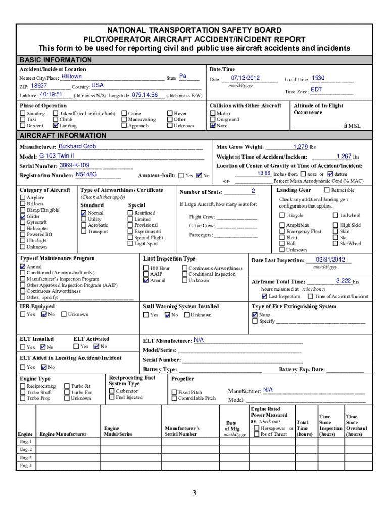 The form must report information including the date and time of the incident, the location, aircraft details, involved personnel, a description of the event, and any injuries or fatalities.