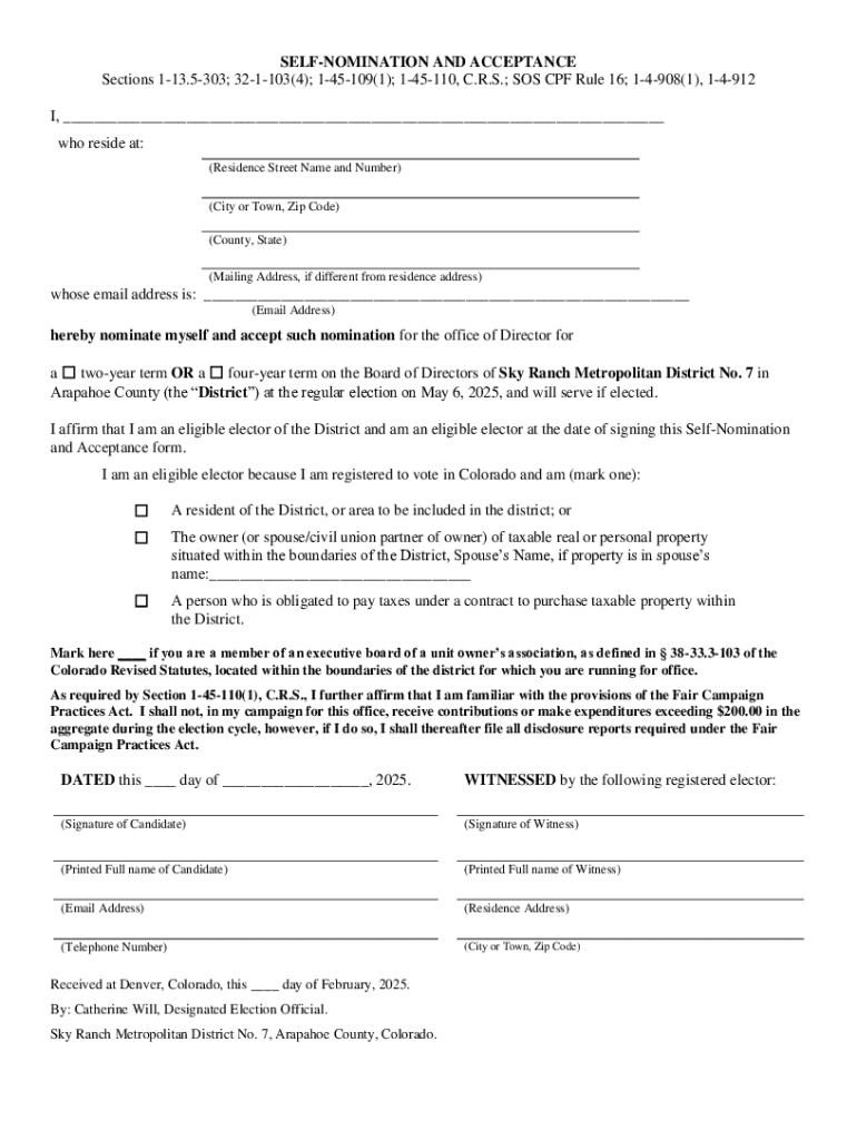 This document is a self-nomination and acceptance form for individuals wishing to run for the office of Director on the Board of Directors of Sky Ranch Metropolitan District No. 7. It requires personal