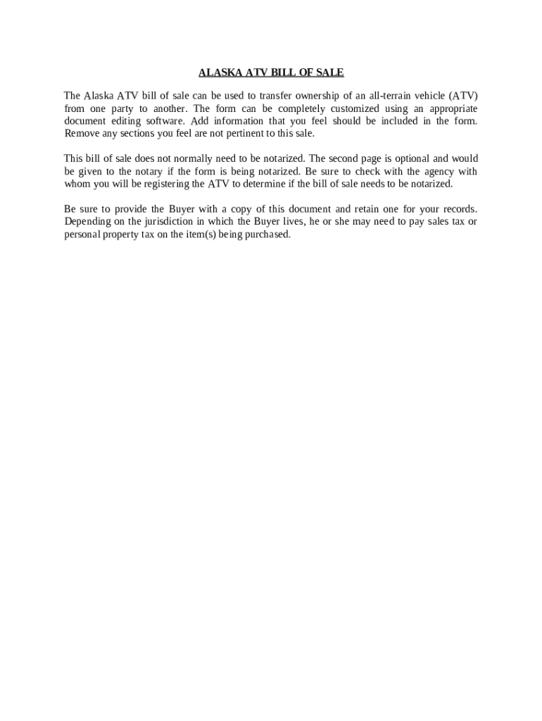 In Alaska, notarization of the ATV Bill of Sale may be necessary depending on the value of the transaction and specific local requirements. Understanding when to notarize can prevent issues during registration.