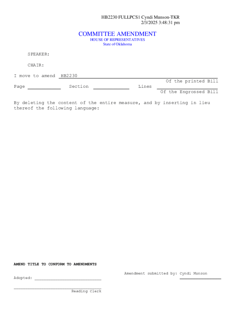 Committee amendment to House Bill 2230 regarding the increase of the minimum wage in Oklahoma, detailing the changes and provisions related to the Oklahoma Minimum Wage Act.