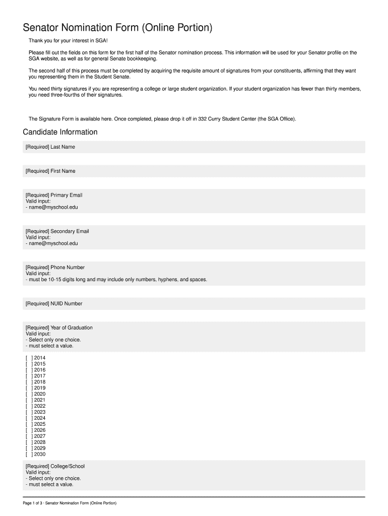 Please fill out the fields on this form for the first half of the Senator nomination process. This information will be