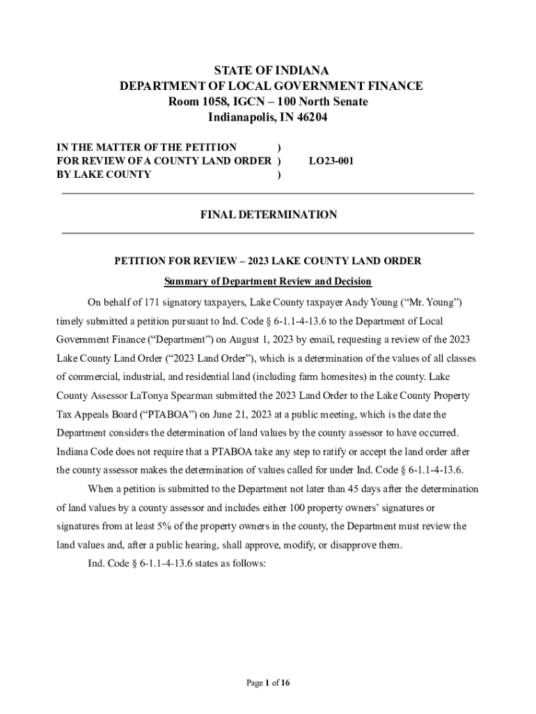This document pertains to the petition submitted by Lake County taxpayer Andy Young for a review of the 2023 Lake County Land Order. It includes a summary of the Department of Local Government Finance\'s