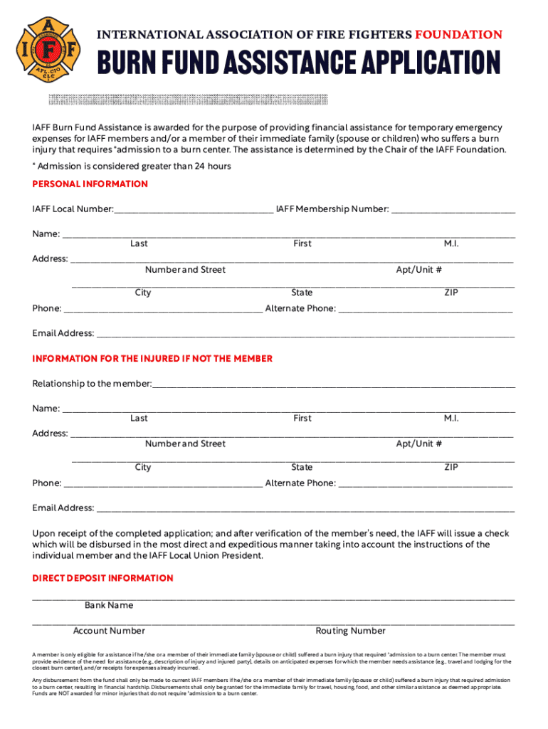 El formulario de solicitud de asistencia del IAFF Burn Fund se otorga para proporcionar asistencia financiera para gastos de emergencia temporales para miembros del IAFF y/o un miembro de su familia