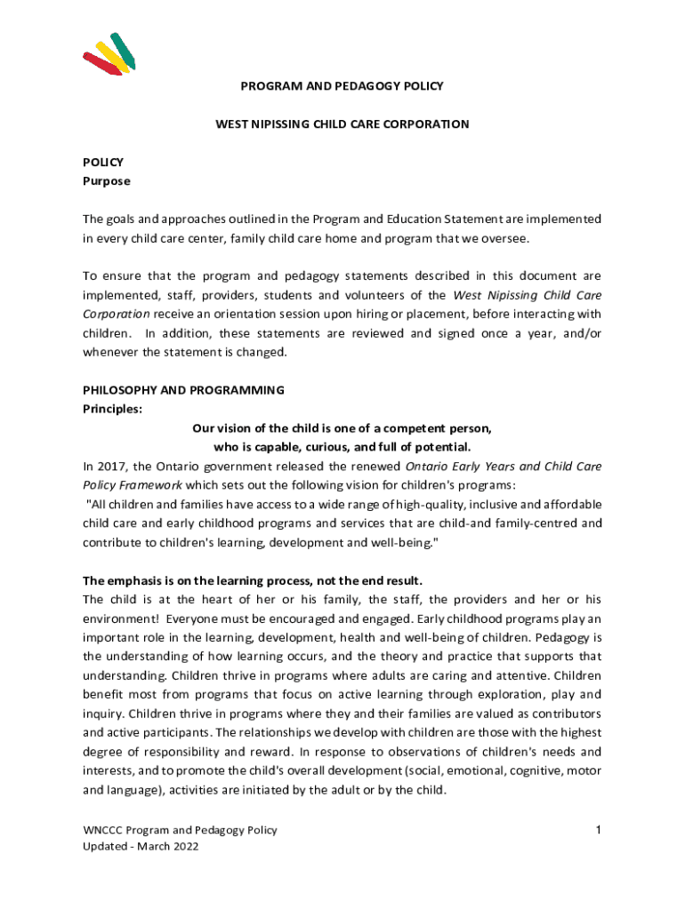 PROGRAM AND PEDAGOGY POLICY WEST NIPISSING CHILD CARE CORPORATION POLICY Purpose The goals and approaches outlined in the Program and Education Statement are implemented in every child care center,
