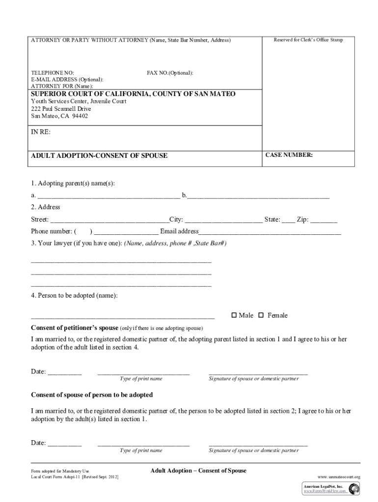 Adult adoption-consent of spouse is a legal process in which a spouse consents to the adoption of an adult, typically to formalize the relationship and extend legal rights and benefits.