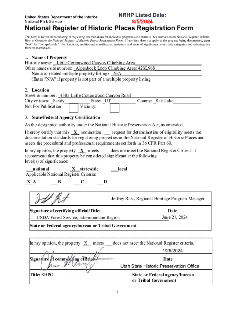 This form is for use in nominating or requesting determinations for individual properties and districts related to the historical significance of the Little Cottonwood Canyon Climbing Area in Utah.