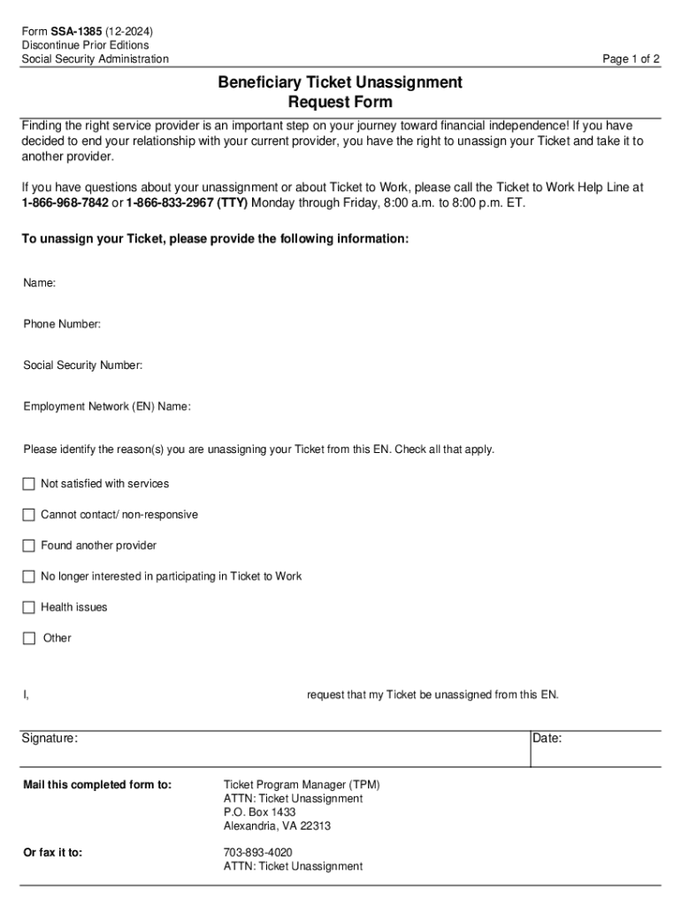 This form allows beneficiaries to unassign their Ticket from a current Employment Network (EN) and transfer it to another provider. It requires personal information and the reason for unassignment.