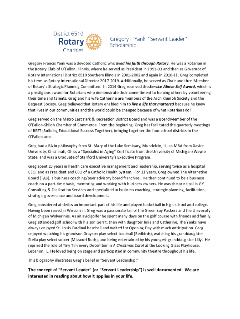 Get the free Gregory F Yank Servant Leader Scholarship Application