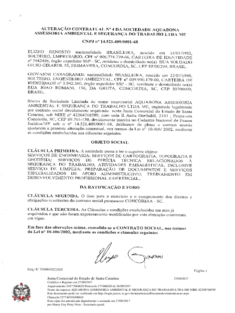 Este documento certifica o registro da empresa Aquabona Assessoria Ambiental e Segurança do Trabalho LTDA, incluindo informações como, natureza jurídica, CNPJ, endereço e atividades econômicas.
