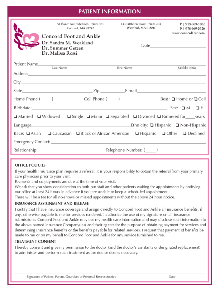 PATIENT INFORMATION P | 9783695282 F | 9783692926 www.concordfeet.com133 Littleton Road Suite 204 Westford, MA 0188654 Baker Ave Extension Suite 301 Concord, MA 01742Concord Foot and Ankle Dr. Sandra
