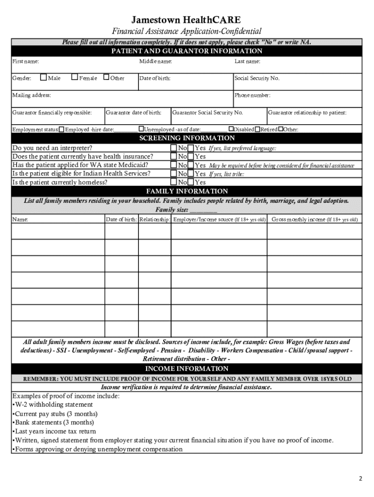 This document outlines the financial assistance options available through Jamestown HealthCARE, including application procedures, eligibility criteria, and necessary documentation for those in need