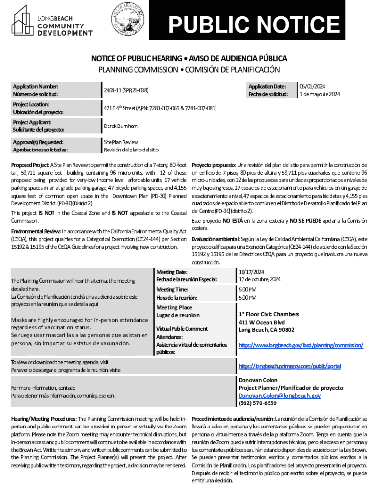 PUBLIC NOTICE NOTICE OF PUBLIC HEARING AVISO DE AUDIENCIA PBLICA PLANNING COMMISSION COMISIN DE PLANIFICACIN Application Number: Nmero de solicitud:240411 (SPR24038)Application Date: Fecha de solicitud:Project