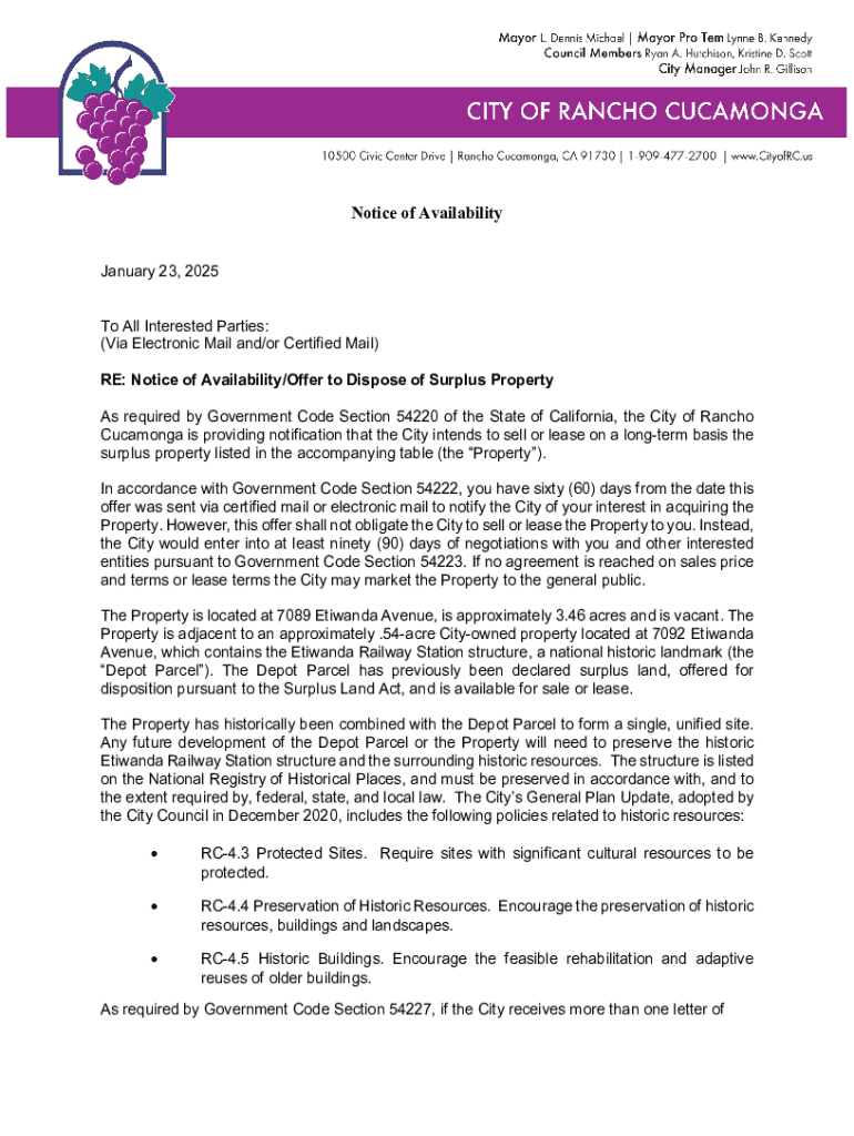 Este documento notifica a las partes interesadas sobre la intención de la Ciudad de Rancho Cucamonga de vender o alquilar una propiedad excedente. Incluye plazos y requisitos para expresar interés