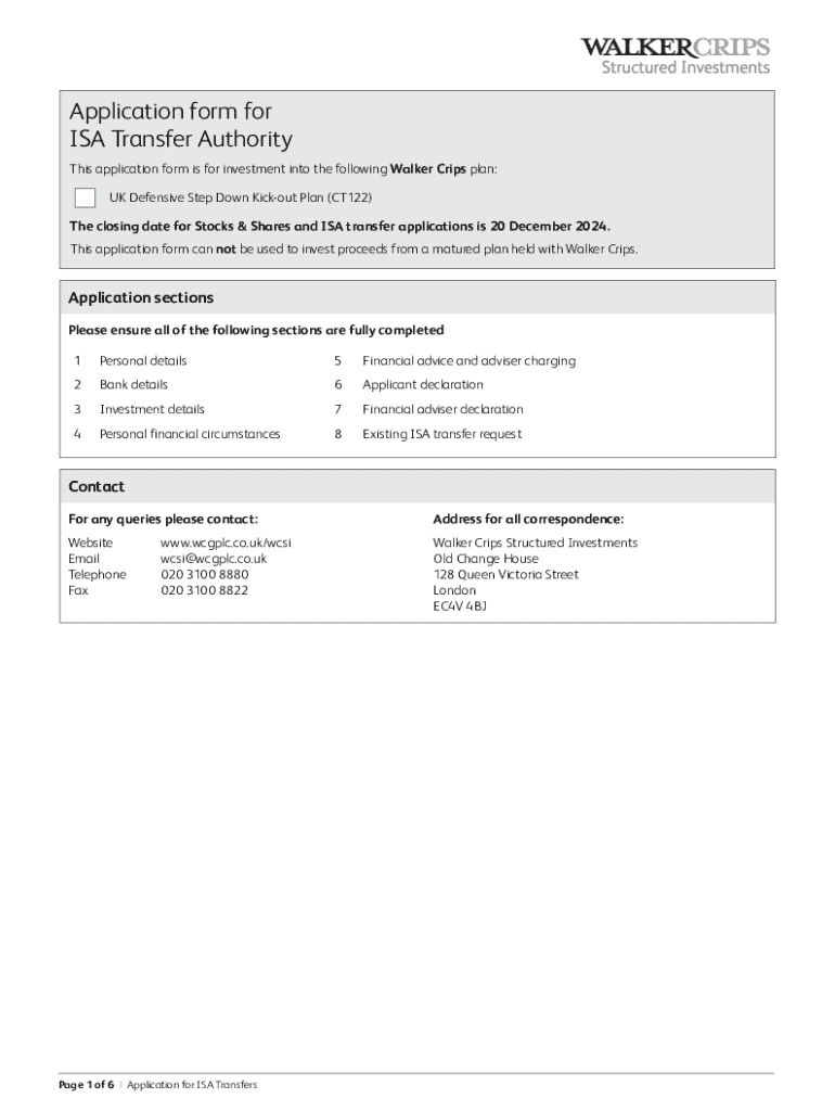 This application form is for investment into the Walker Crips UK Defensive Step Down Kick-out Plan (CT122), allowing customers to transfer ISAs with a closing date of 20 December 2024 for applications.