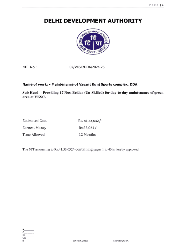 P a g e |1DELHI DEVELOPMENT AUTHORITYNIT No.:07/VKSC/DDA/202425Name of work: Maintenance of Vasant Kunj Sports complex, DDASub Head: Providing 17 Nos. Beldar (UnSkilled) for daytoday maintenance of