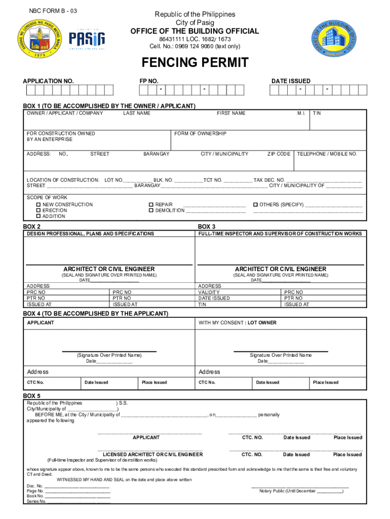 This form is used to apply for a fencing permit in the Republic of the Philippines, specifically in the City of Pasig. The document requires the applicant to provide personal information, scope of
