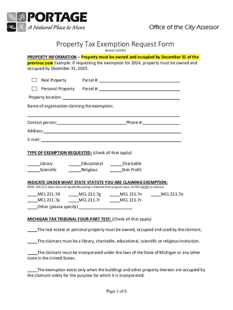 This form is used to request an exemption from property taxes for real or personal property owned and occupied by an organization as of December 31 of the previous year. It includes sections for property