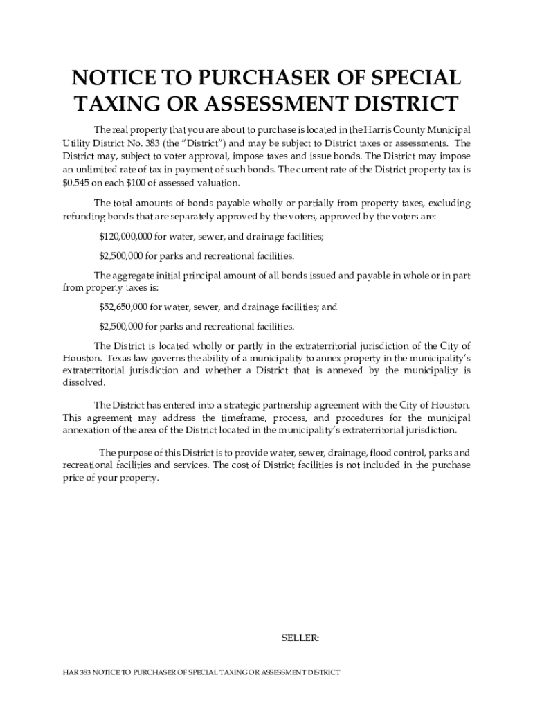 NOTICE TO PURCHASER OF SPECIAL TAXING OR ASSESSMENT DISTRICT The real property that you are about to purchase is located in the Harris County Municipal Utility District No. 383 (the District) and