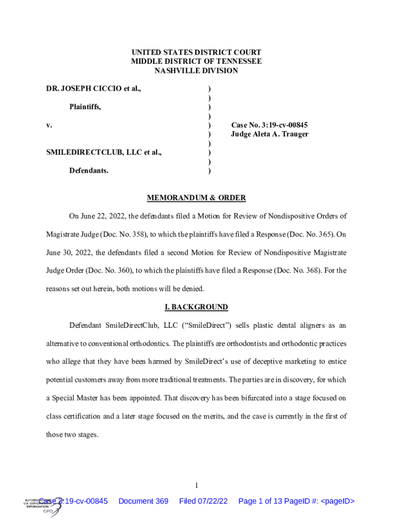 UNITED STATES DISTRICT COURT MIDDLE DISTRICT OF TENNESSEE NASHVILLE DIVISION DR. JOSEPH CICCIO et al.,) ) ) ) ) ) ) ) ) )Plaintiffs, v. SMILEDIRECTCLUB, LLC et al., Defendants.Case No. 3:19cv00845