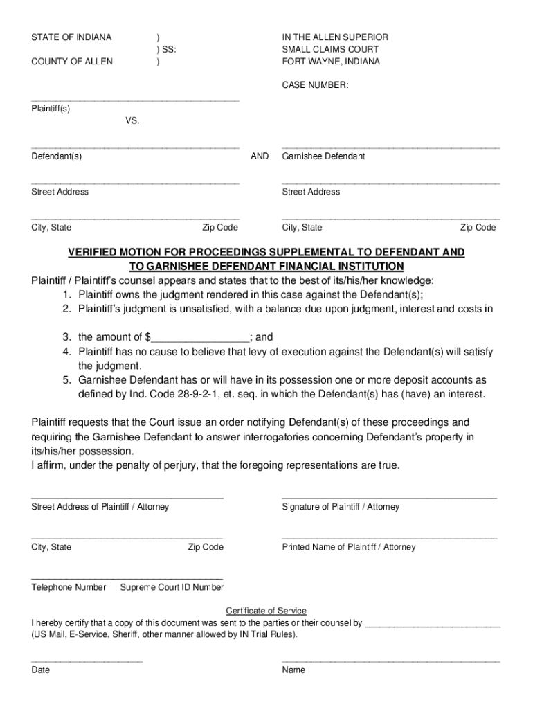 STATE OF INDIANA) ) SS: )COUNTY OF ALLENIN THE ALLEN SUPERIOR SMALL CLAIMS COURT FORT WAYNE, INDIANA CASE NUMBER:___ Plaintiff(s) VS. ___ Defendant(s)AND___ Garnishee Defendant___ Street Address___