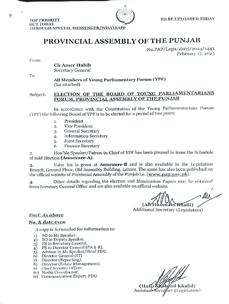 This document is a nomination paper used for proposing candidates for election to the Board of Young Parliamentarians Forum from the Provincial Assembly of the Punjab. It includes sections for the