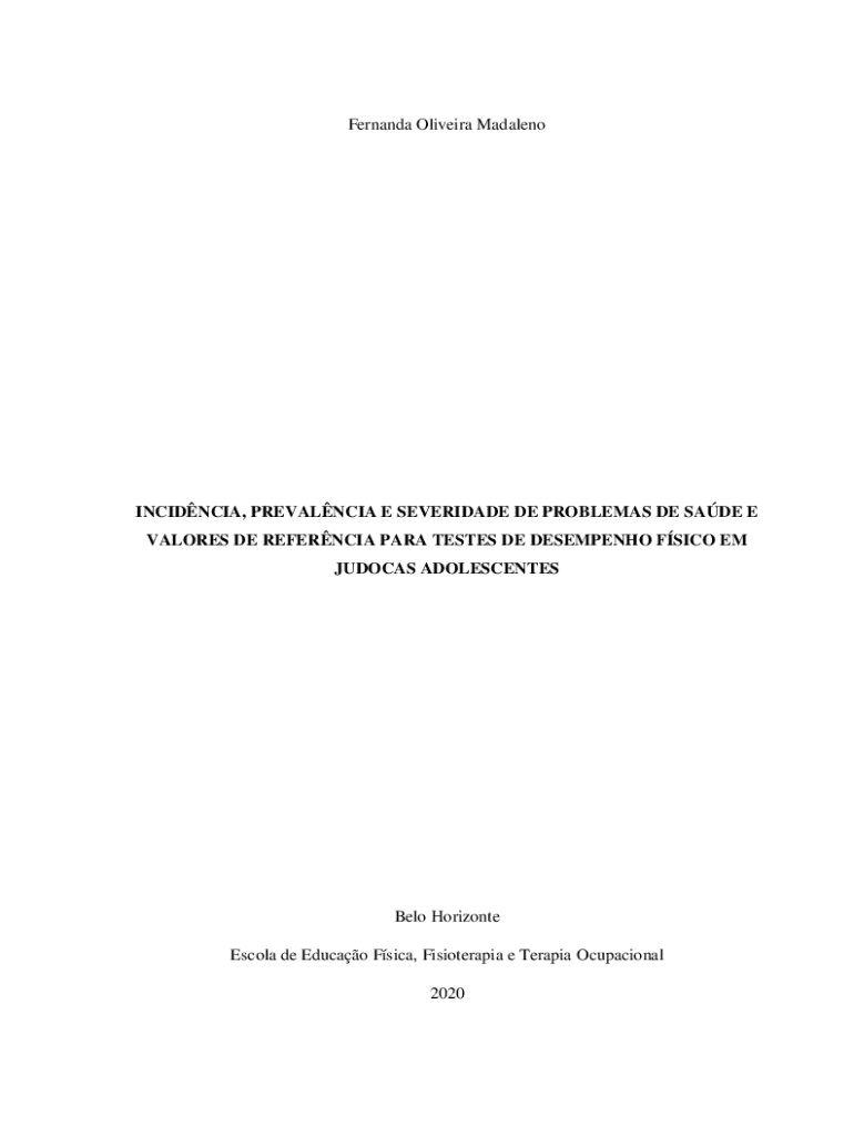 Fernanda Oliveira MadalenoINCIDNCIA, PREVALNCIA E SEVERIDADE DE PROBLEMAS DE SADE E VALORES DE REFERNCIA PARA TESTES DE DESEMPENHO FSICO EM JUDOCAS ADOLESCENTESBelo Horizonte Escola de Educao Fsica,