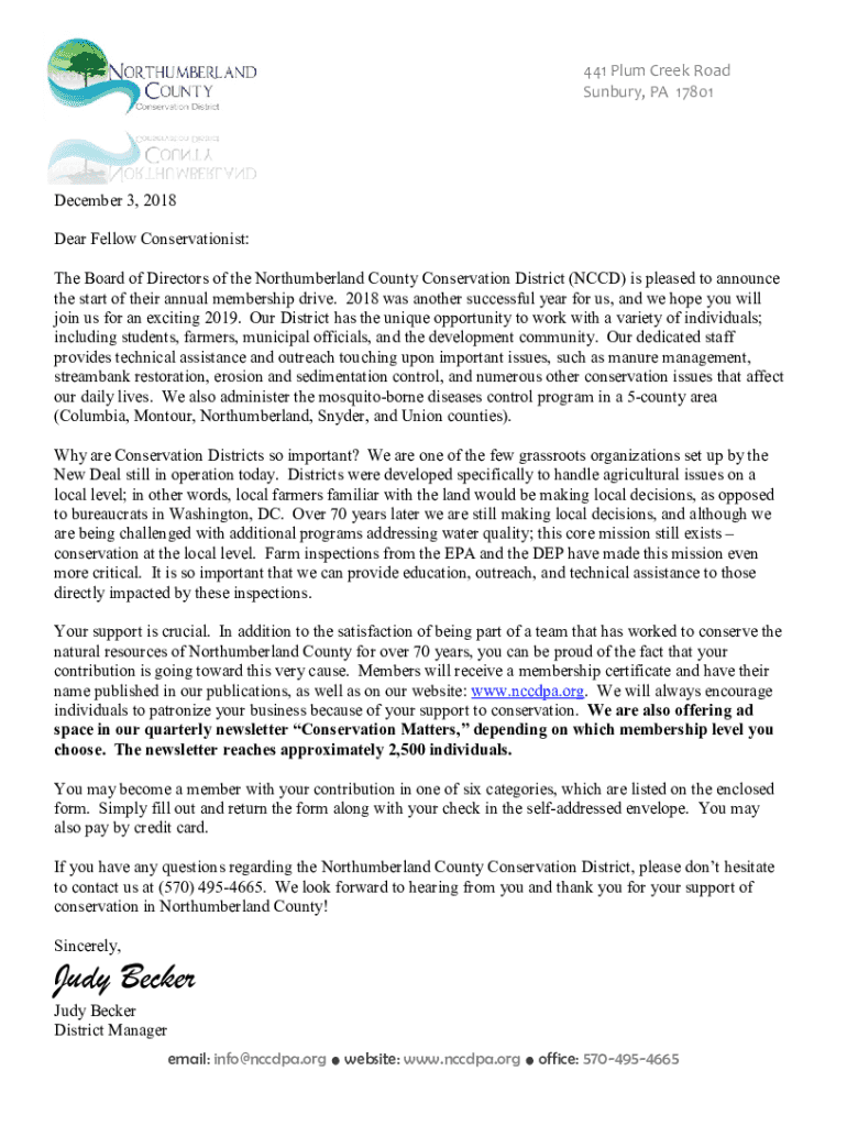 This document serves as a membership application for the Northumberland County Conservation District, outlining various membership levels, donation options, and the importance of conservation efforts