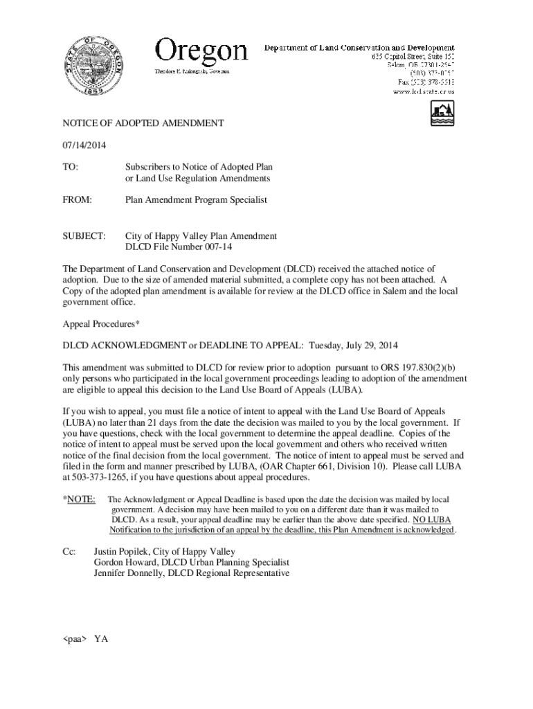 This document serves as a notice regarding the adoption of a plan amendment for the City of Happy Valley. It outlines appeal procedures, deadlines, and procedural requirements for interested parties.