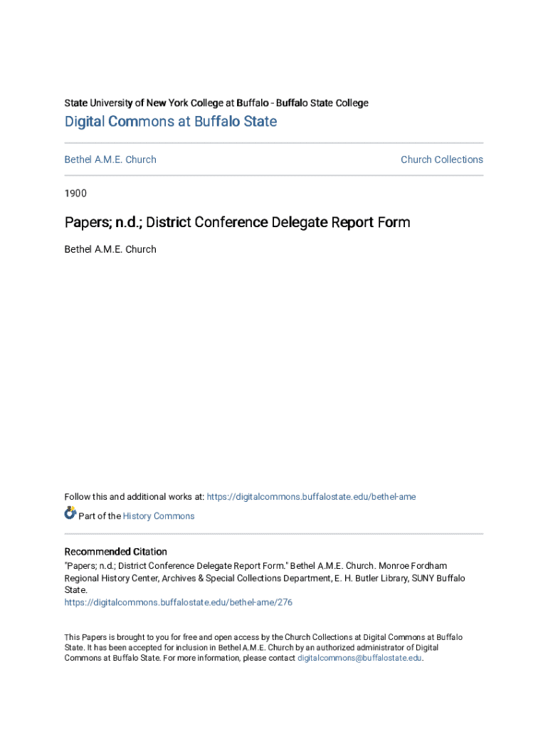A form used for reporting by delegates at the District Conference of the Bethel A.M.E. Church, gathering various statistics and information about church leadership, membership, and activities.