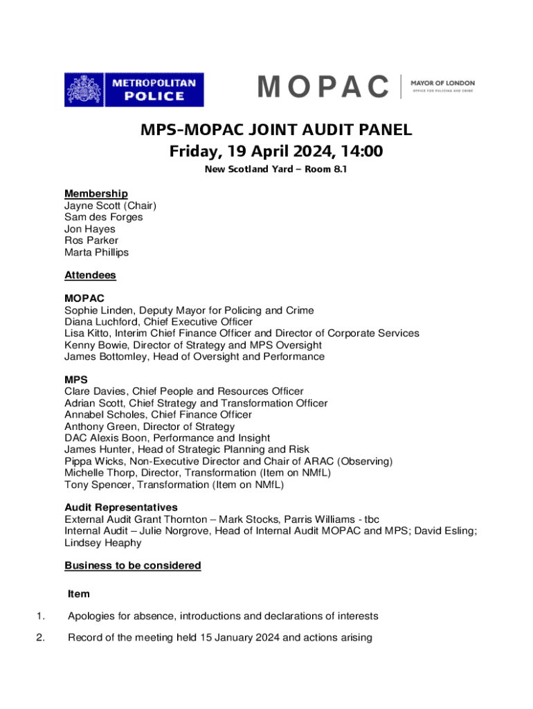 MPSMOPAC JOINT AUDIT PANEL Friday, 19 April 2024, 14:00 New Scotland Yard Room 8.1 Membership Jayne Scott (Chair) Sam des Forges Jon Hayes Ros Parker Marta Phillips Attendees MOPAC Sophie Linden,