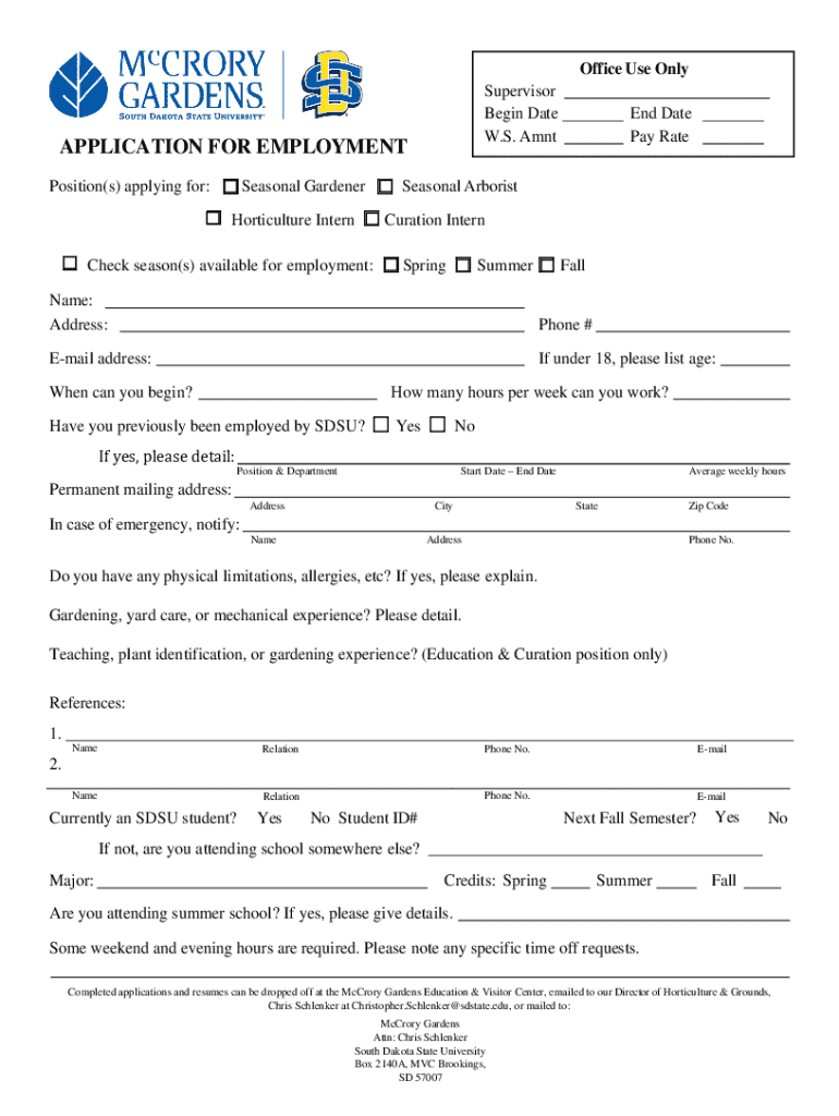 This document is an application form for seasonal employment positions such as Seasonal Gardener, Horticulture Intern, Seasonal Arborist, and Curation Intern at South Dakota State University. It collects
