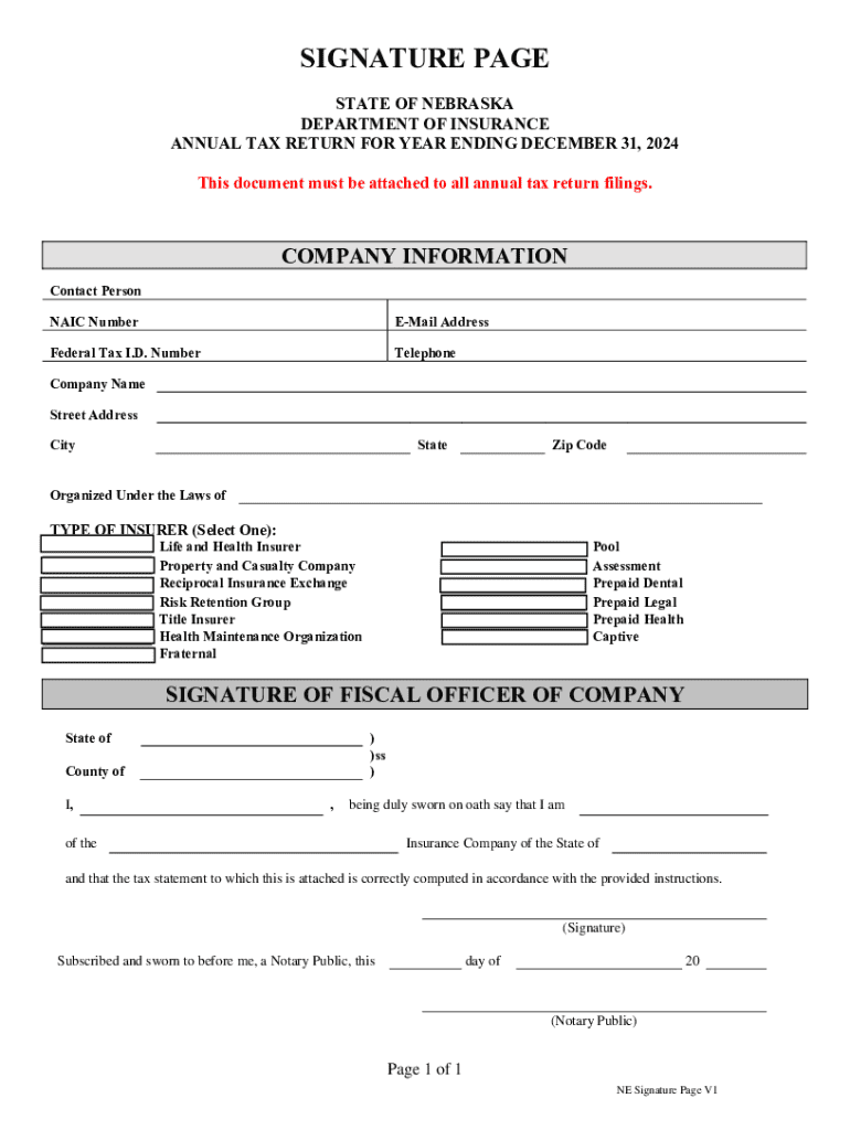 This document must be attached to all annual tax return filings for insurance companies in the State of Nebraska, certifying that the tax statement is correctly computed in accordance with the provided
