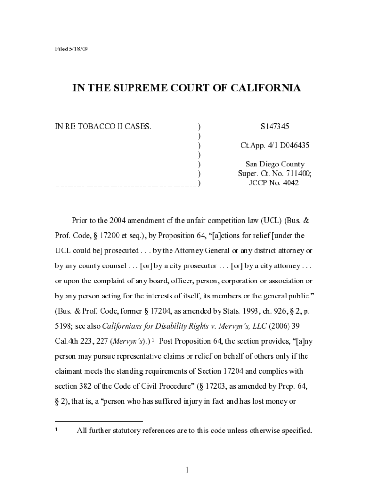This document discusses the legal proceedings and implications following the 2004 amendment of the Unfair Competition Law in California, focusing on the class action status of the Tobacco II Cases