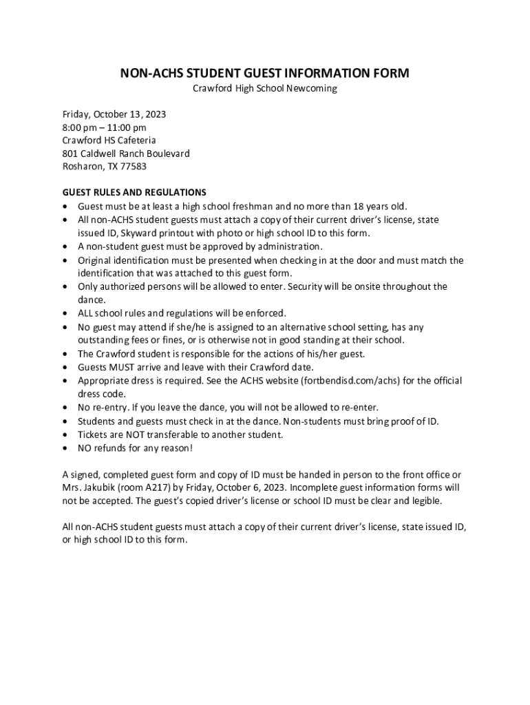 This form is required for non-ACHS student guests attending the Crawford High School Newcoming dance. It includes guest rules and regulations that must be followed, details on required identification,