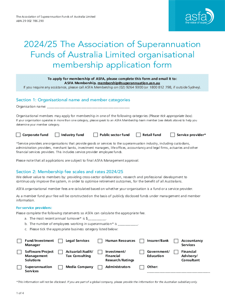 This form is used to apply for membership in the Association of Superannuation Funds of Australia Limited (ASFA) for the year 2024/25. It requires information about the organization, member category