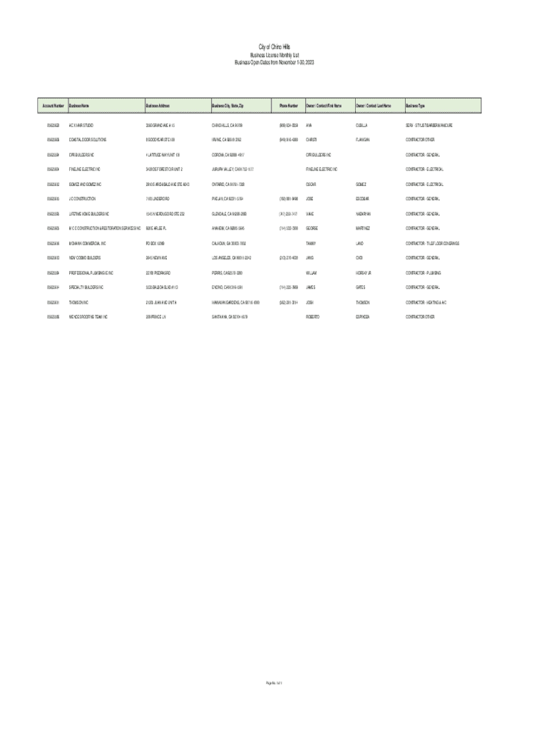 This document contains a list of businesses that opened in the City of Chino Hills from November 1-30, 2023, including details such as account number, business name, address, contact information,