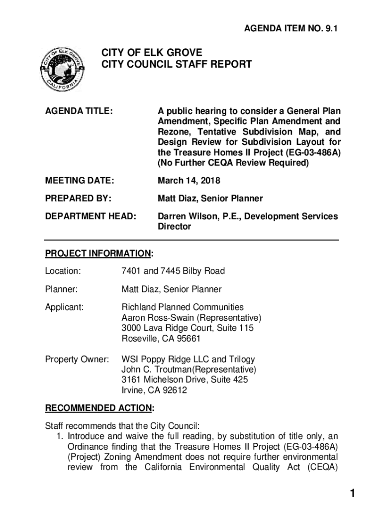 AGENDA ITEM NO. 9.1CITY OF ELK GROVE CITY COUNCIL STAFF REPORTAGENDA TITLE:A public hearing to consider a General Plan Amendment, Specific Plan Amendment and Rezone, Tentative Subdivision Map, and