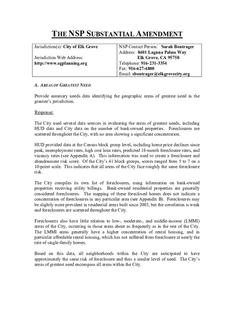 This document outlines the NSP Substantial Amendment for the City of Elk Grove, detailing the areas of greatest need, fund distribution, definitions, low-income targeting, acquisitions, and rehabilitation