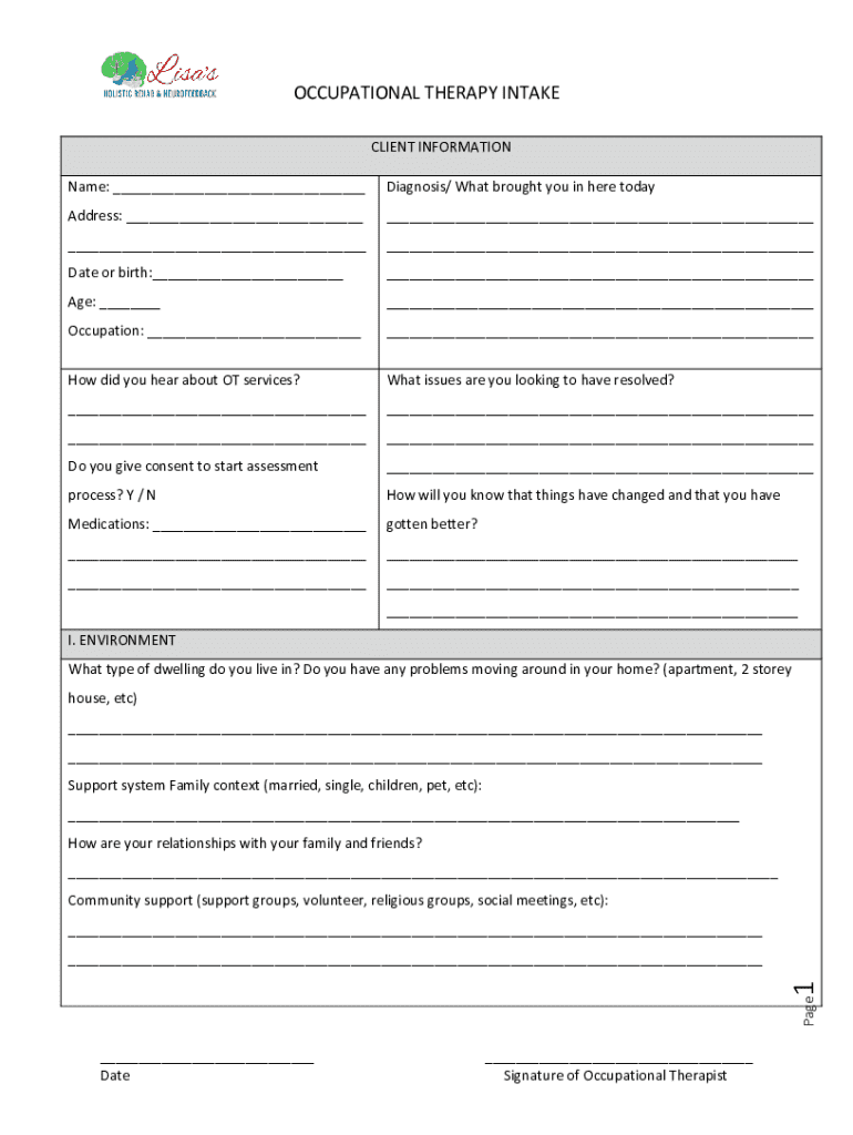 Typically, patients seeking occupational therapy services are required to complete the occupational therapy intake form, along with any referring healthcare providers.